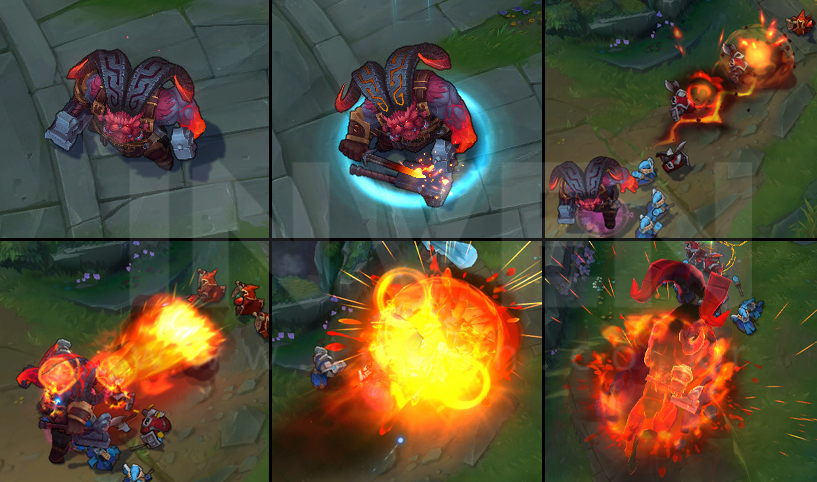 Ornn summons a massive elemental at a location which travels toward him with increasing speed. Enemies run over by the elemental take damage, are slowed and are made Brittle. Ornn can recast the ability to charge into the elemental, redirecting it in the direction he hits it, causing the elemental to affect any enemies it runs over to be knocked up, dealing the same damage and re-applying Brittle.