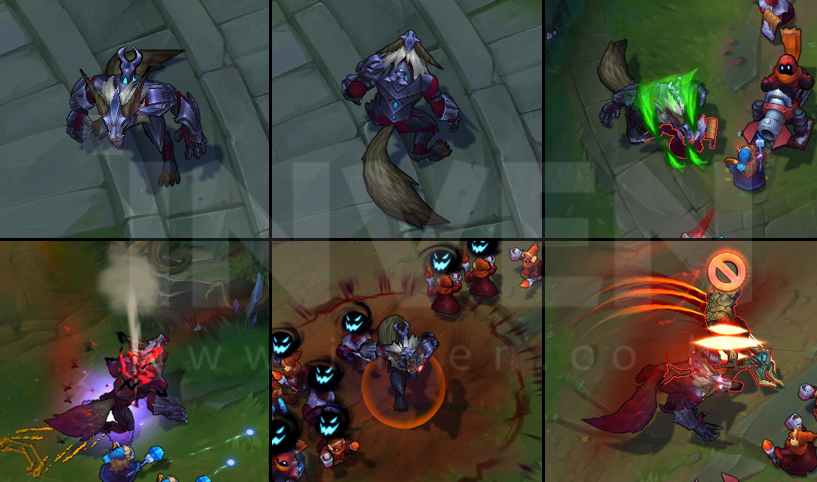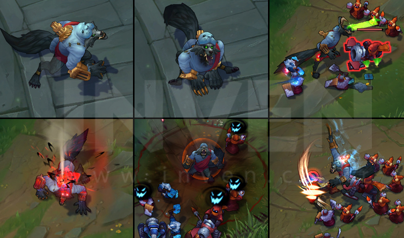 Warwick is a monster who hunts the gray alleys of Zaun. Transformed by agonizing experiments, his body is fused with an intricate system of chambers and pumps, machinery filling his veins with alchemical rage. He bursts from the shadows to prey upon those criminals who terrorize the city's depths. Warwick is drawn to blood, driven mad by its scent… and none who spill it can escape him.