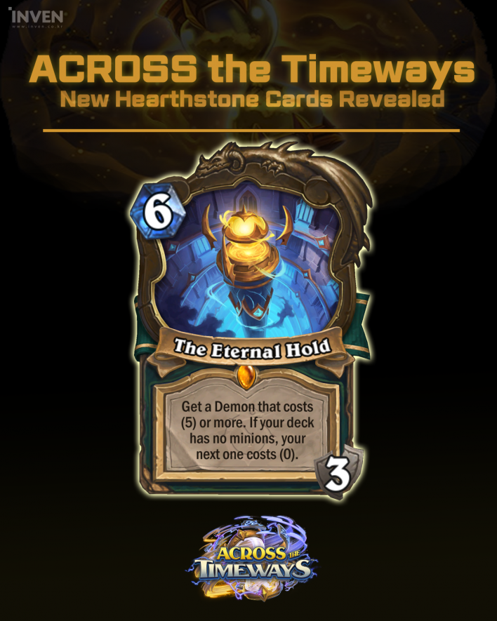 The Eternal Hold completes the new no-minions Demon Hunter archetype. As a Location, it has 3 Durability and can be activated on alternating turns; each activation adds a random (5)+-Cost Demon to your hand and, with the condition met, sets your next Demon to (0) Cost—which can apply to a Demon already in your hand, not just the one it generated. Over time, it accrues significant value and enables multiple zero-Cost Demon turns.