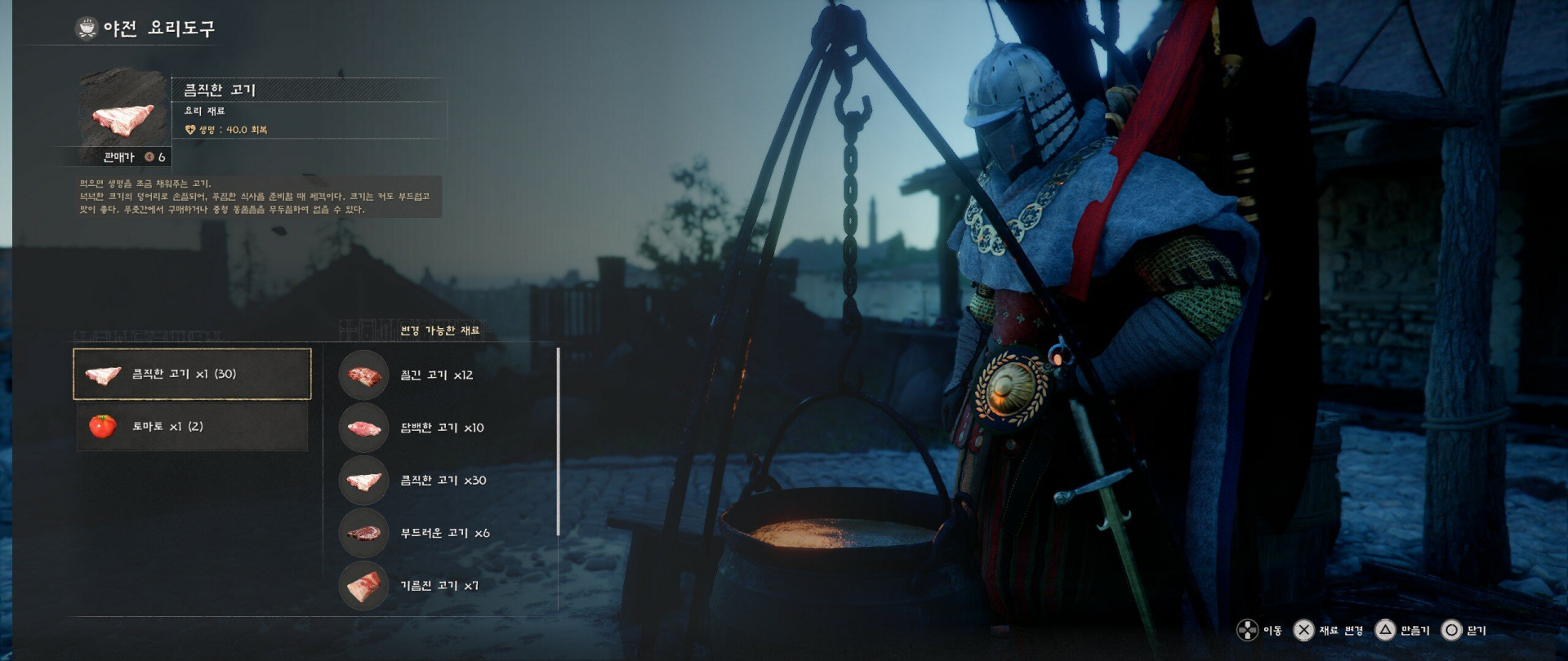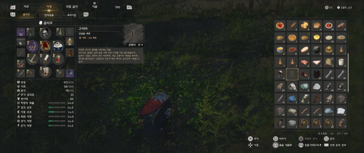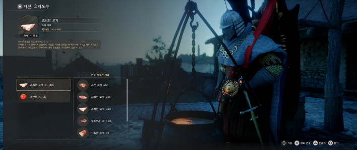 The content design itself further squeezes this already cramped inventory. Gear and consumables for sub-characters you barely use still occupy bag space, and once cooking comes into the picture, even meat—which is all ultimately consumed simply as meat—is divided into five separate types: tender meat, tough meat, fatty meat, chunky meat, and lean meat. Likewise, grains that are all just treated and consumed identically as grain are split into several different items such as beans, lentils, barley, wheat, and oats.