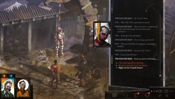 The gameplay is similar to 'Planescape: Torment.' However, there is almost no combat; it is entirely focused on exploration and text. The key elements are your stats and the choices you make. In 'Disco Elysium,' you don't just talk to NPCs; you interact with objects, and your own 'skills' talk to you directly.