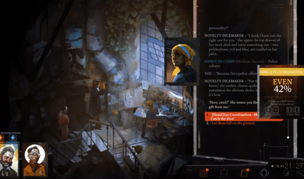 These skills are the core of the game. They are personified with icons that look like 'faces,' each with their own distinct personality and tone—like the unhinged, dramatic 'Drama' skill or the fascist-leaning 'Endurance.' Because these skills constantly chime in, the detective's mind is incredibly noisy despite his memory loss. They act as both gameplay constraints and guides that help you understand the situation. Their chatter is constant, and because their personalities are so varied and the writing is so entertaining, it’s a joy to read.