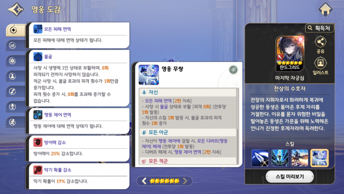 Furthermore, if Landgrid is hit with crowd control (CC), it cleanses all debuffs from all allies and grants immunity to CC for 2 turns. Landgrid also boasts high survivability: upon death, it revives with 1 HP and gains 'Indomitable' (preventing death until hit 8 times) along with 2 turns of immunity to all damage. Activating a skill while in the Indomitable state extends the effect by one additional hit. Overall, the passive is well-rounded, covering constant enemy debuffs, ally support, and personal survivability.