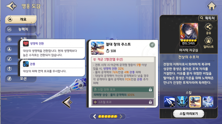 Still, if you enjoy PvP content with an attack deck as your main, Landgrid offers significant value. It has good survivability, supports allies, and can even function as a sub-dealer. If you are focusing on other team compositions, however, Transcendence level 6 does not seem strictly necessary. You could aim for level 2 or 4 to make gear setting easier and secure the hero for the long term. Since the level 6 effect, 'Absolute Spear: Just,' resets the cooldown rather than allowing for continuous activation, it may not feel as impactful as expected. If you are debating the level of transcendence, keep this in mind.