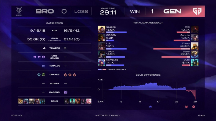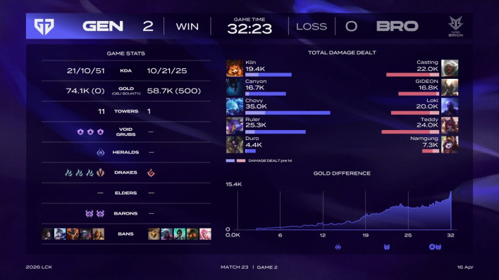 The walls from Chovy's Anivia repeatedly trapped HanJin Brion's champions, leading to kills. 'Ruler' Park Jae-hyuk's Jhin quickly grew to a 4/0/1 scoreline, and the gold lead ballooned to over 7,000. Around the 22-minute mark, HanJin Brion attempted to force a teamfight using the ultimates of Ryze and 'Gideon' Kim Min-sung's Pantheon, but they could not overcome the difference in firepower. Gen.G Esports widened the gap to over 10,000 gold and secured the victory in Game 2.