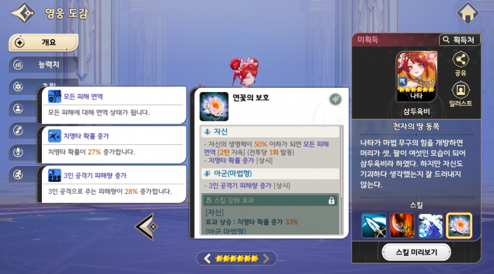 Nata’s passive increases her own Critical Hit rate by 27%, aiding in equipment settings. Additionally, she increases the 3-target attack damage of allied Magic-type heroes deployed with her. If Nata’s HP drops below 50%, she gains 2 turns of immunity to all damage, providing a basic survival mechanism. At Transcendence level 2, she can also provide a shield to all allies when using skills.