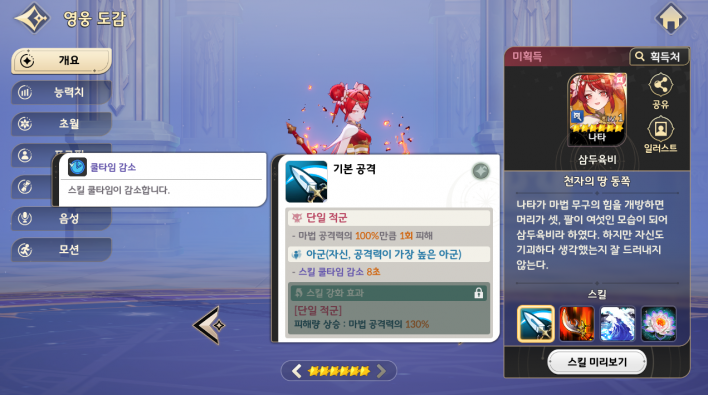 Her two active skills hit once but have solid coefficients, with damage increasing based on the target's lost HP. Both skills target three enemies, and upon reaching Transcendence level 6, her second skill, 'Huncheon-neungpa,' gains an Armor Pierce effect. Her basic attacks are also highly valuable, as they provide an 8-second cooldown reduction for herself and the ally with the highest Attack. Nata is likely to be used alongside other dealers like Ruri when magic damage is needed in 3-player content such as Guild Raids.
