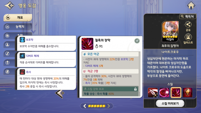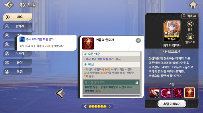 Akila, a staple in Instant Death decks, has been reborn. Her passive now permanently increases the Instant Death effect application probability for all allies, enhancing team utility. The self-HP recovery effect that triggers when HP falls below 50% has been increased from once per battle to twice, and the 'Link' effect previously on her active skill 'Veil of Darkness' has been moved to a passive effect at Transcendence level 6.