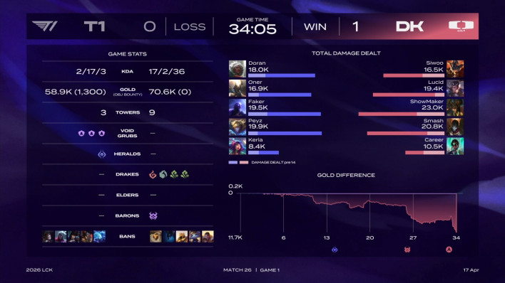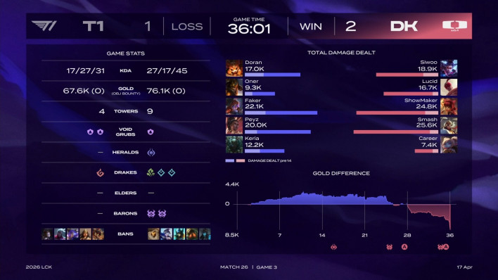 In the match between Dplus KIA and T1 held on the 17th at LoL PARK in Jongno during the first round of the 2026 League of Legends Champions Korea (LCK) regular season, Dplus KIA secured a 2-1 victory. The final game of the series showcased a transformed Dplus KIA. Despite a disadvantageous start, the team did not falter, steadily clawing back their losses and maintaining the momentum of their comeback until the very end.