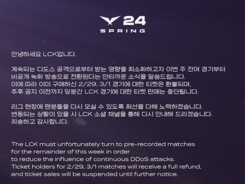 LCK disrupted by DDoS attacks, league will broadcast private pre-recorded matches
