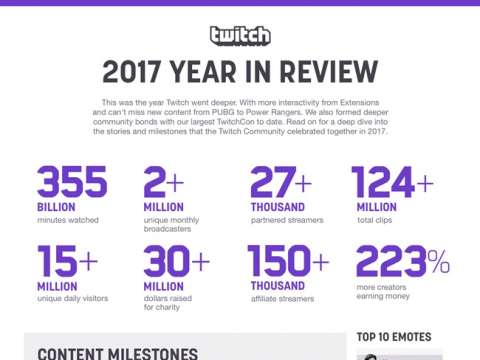 A social streaming platform, Twitch, looked back at the year and revealed their global data for 2017.On the 7th, according to the revealed data, Twitch had a total of 355 billion minutes watched. Twit