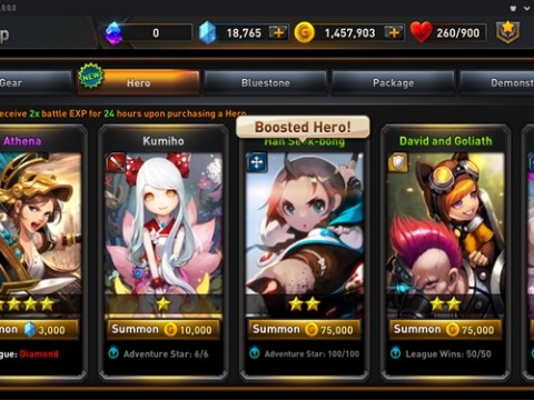 In the Shop menu, you can buy new Heroes and gear that will make your Heroes more powerful. You can also make microtransactions to buy Bluestones and packages or buy Gear Upgrade Materials with Demons