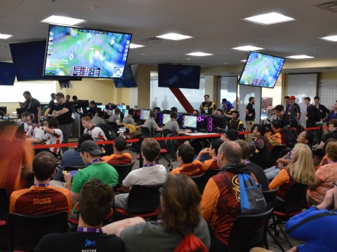The venue was filled with teams huddled around their respective coaches and analysts. It was a mosaic of different schools, each patch of color representing a different esports program colored by the familiar esports jersey designs.