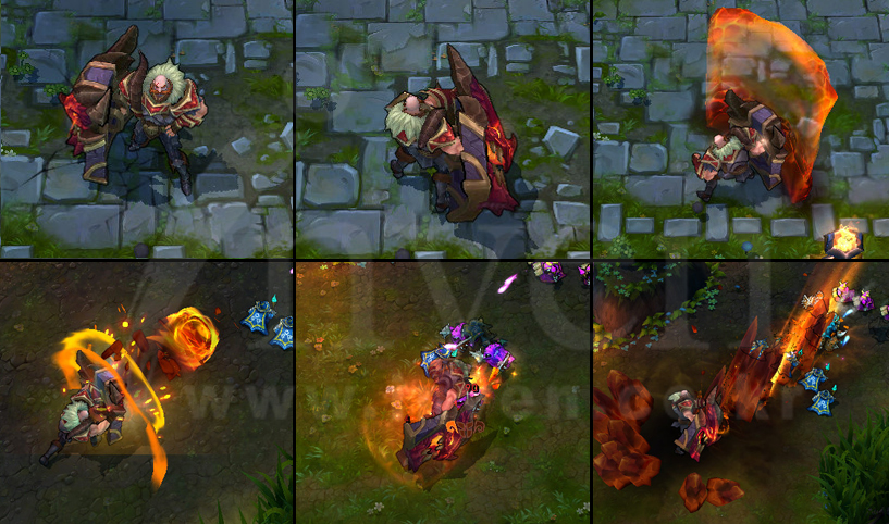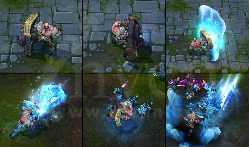 Braum slams the ground, knocking up enemies nearby and in a line in front of him. A fissure is left along the line that slows enemies.