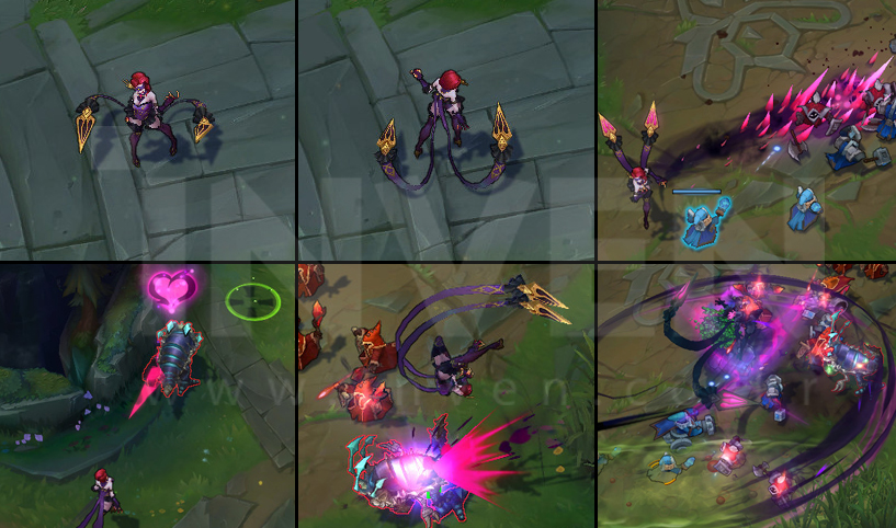 Evelynn strikes out with her Lasher, dealing damage to the first unit hit. Then, Evelynn can shoot a line of spikes at nearby foes a few times.