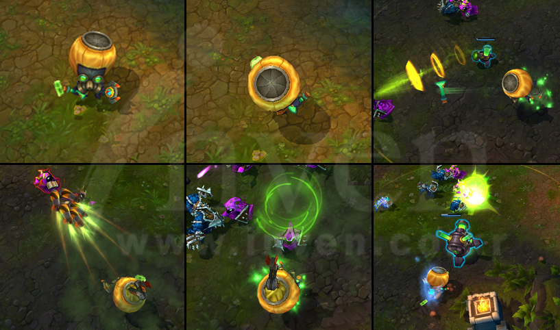 Heimerdinger lays down a rapid-fire cannon turret equipped with a secondary pass-through beam attack (turrets deal half damage to towers).