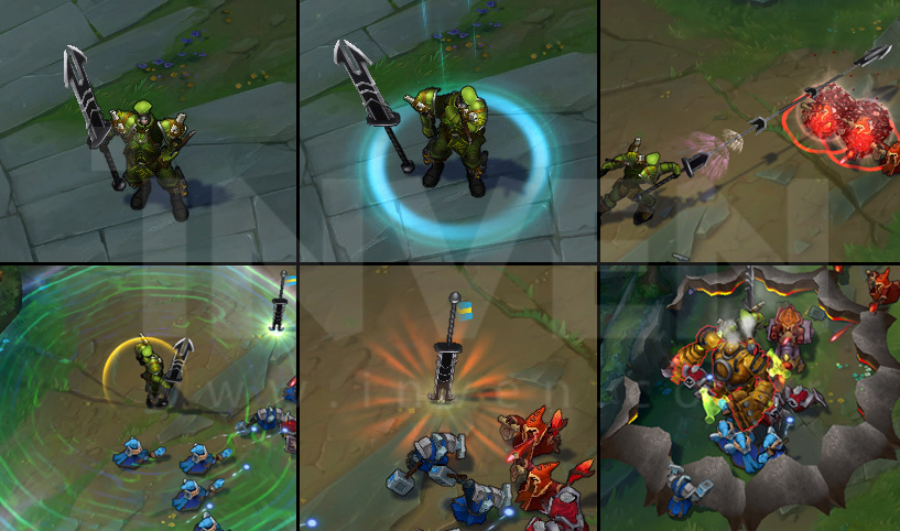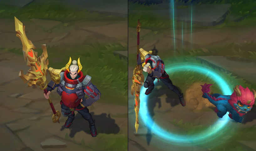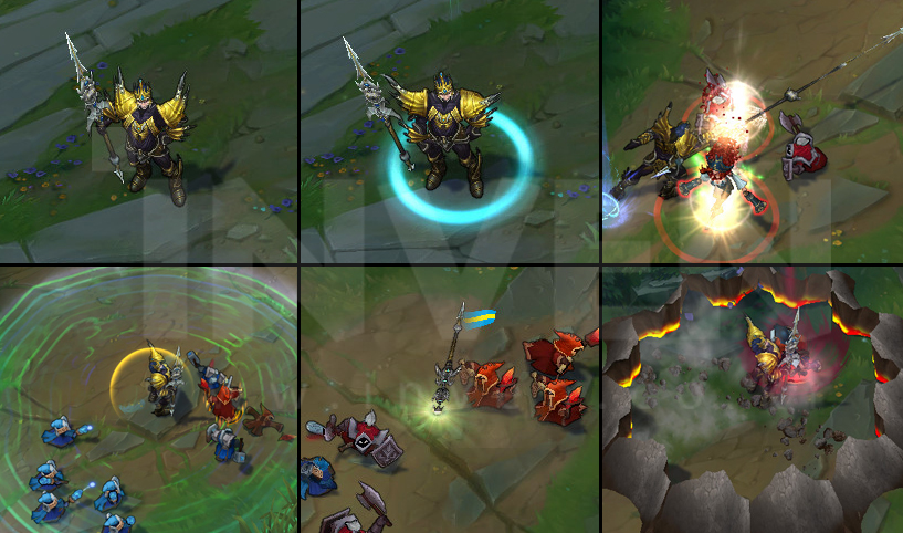 Jarvan IV heroically leaps into battle at a target with such force that he terraforms the surrounding area to create an arena around them. Nearby enemies are damaged at the moment of impact.