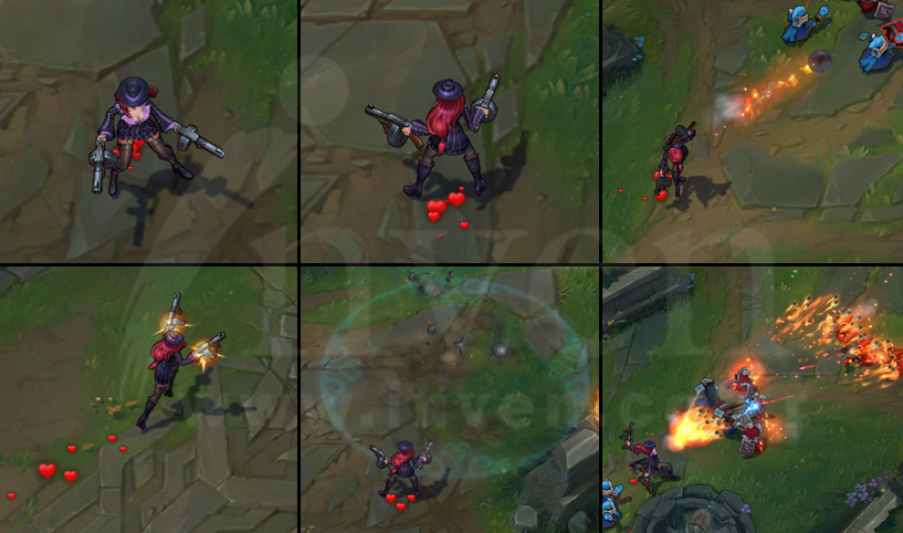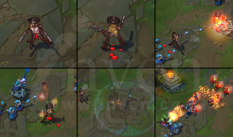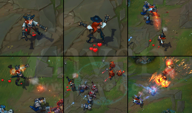 Miss Fortune fires a bullet at an enemy, damaging them and a target behind them. Both strikes can also apply Love Tap.