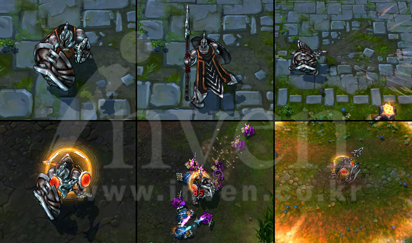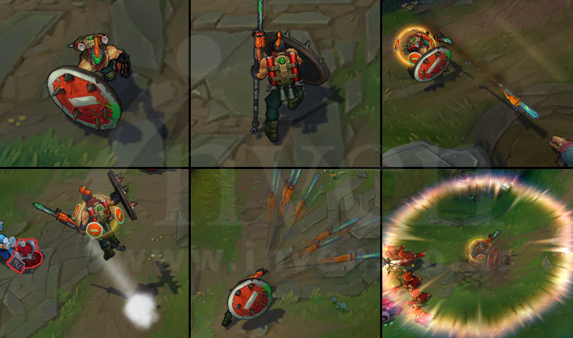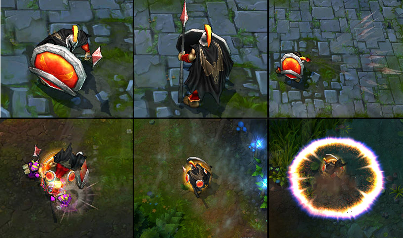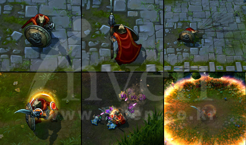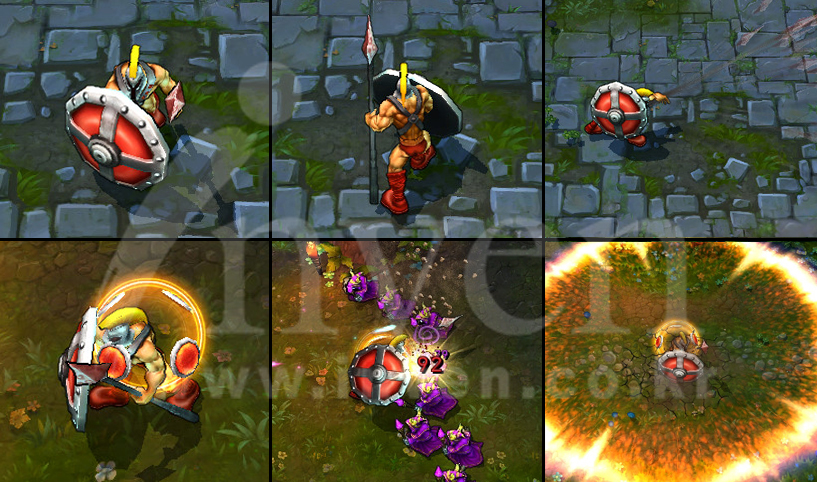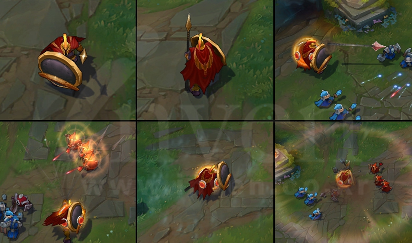 Pantheon sets his shield, becoming invulnerable to damage from the front and striking repeatedly with his spear.