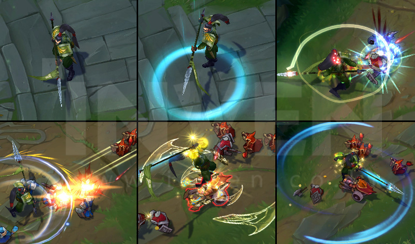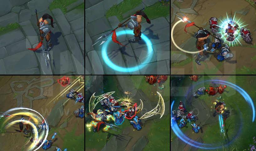 Xin Zhao slashes in front of himself with his spear, then thrusts it forward, slowing affected enemies and marking them as Challenged.