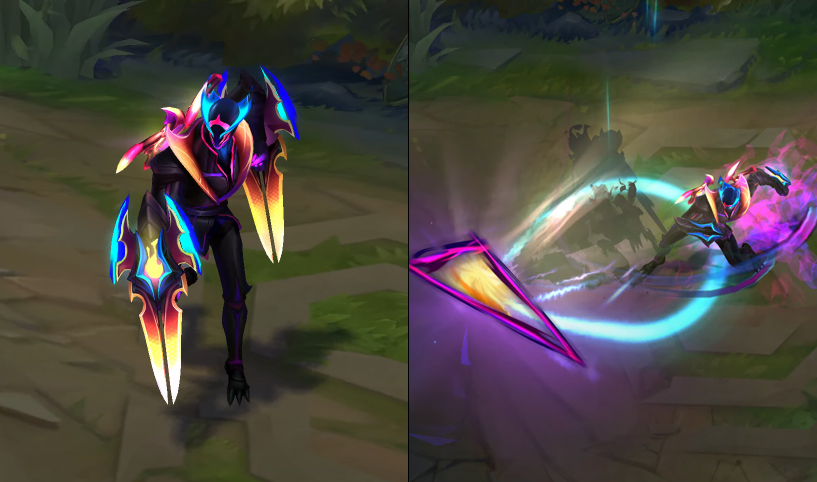 Zed and his Shadows slash, dealing damage to nearby enemies. Enemies hit by a Shadow's slash are slowed.