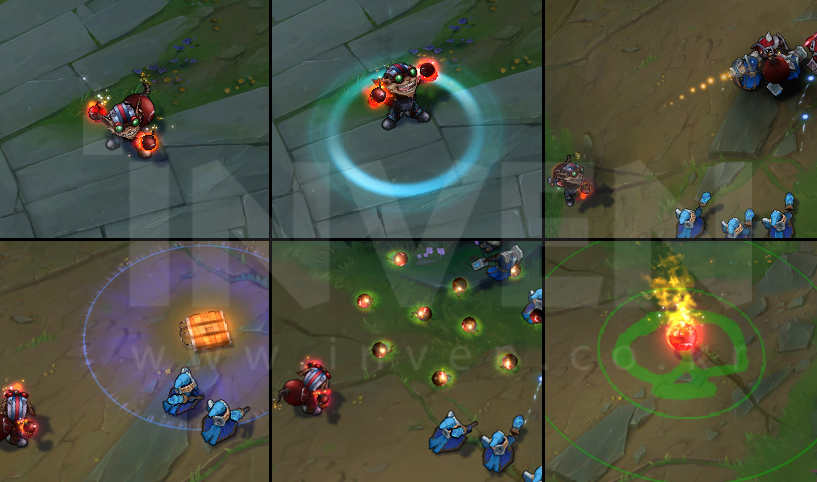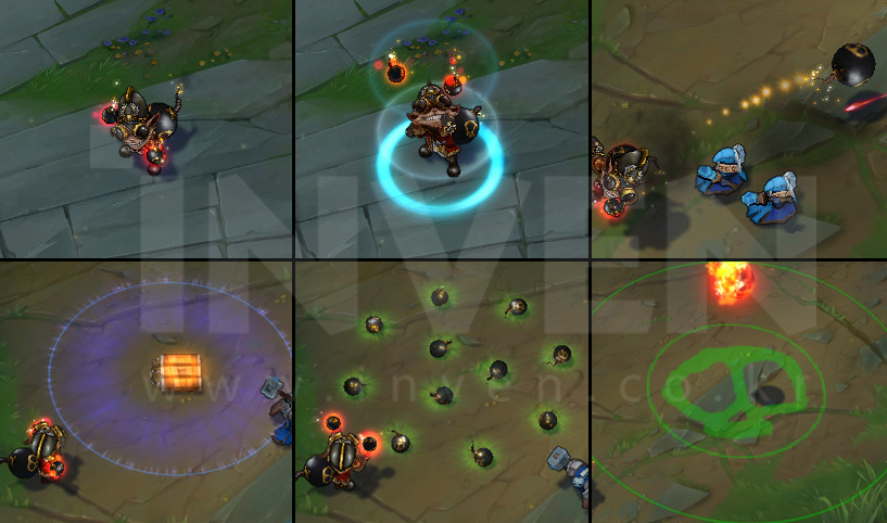 Ziggs deploys his ultimate creation, the Mega Inferno Bomb, hurling it an enormous distance. Enemies in the primary blast zone take more damage than those farther away.