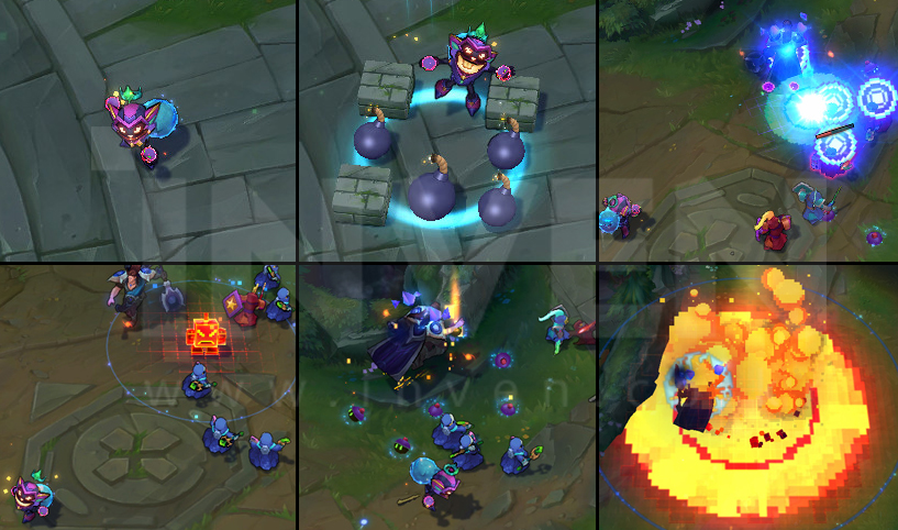 Ziggs scatters proximity mines that detonate on enemy contact, dealing magic damage and slowing. Successive mine detonations on the same target deal reduced damage.