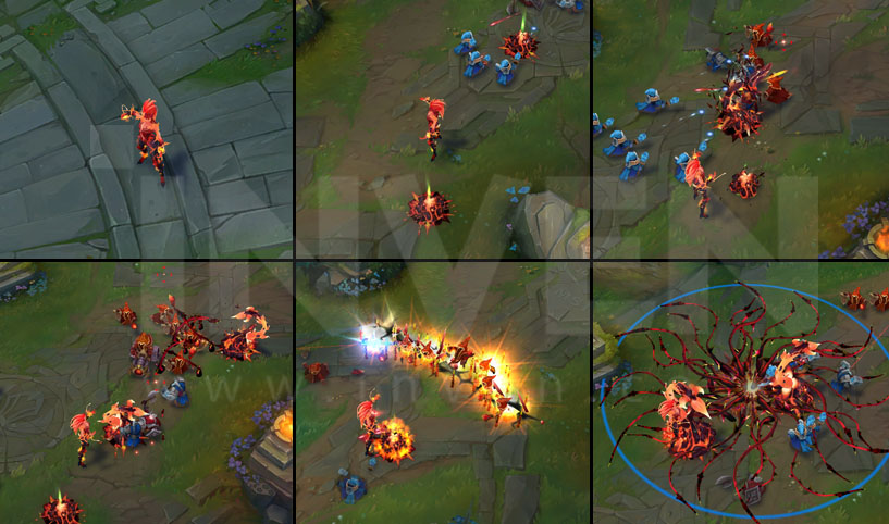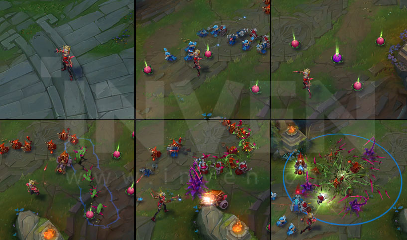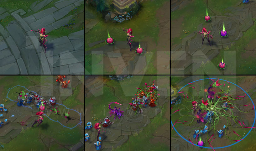 [ Passive ]Seeds spawn around Zyra periodically, becoming faster with level. Zyra can cast Deadly Spines or Grasping Roots near seeds to grow plants, who fight for Zyra.