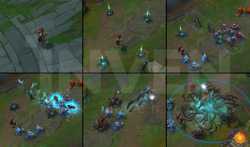 Zyra summons a twisted thicket at her target location, dealing damage to enemies as it expands and knocking them airborne as it contracts. Plants within the thicket are enraged.
