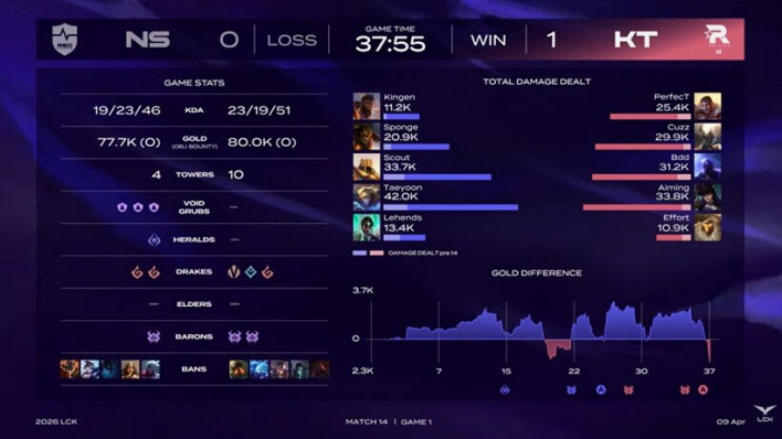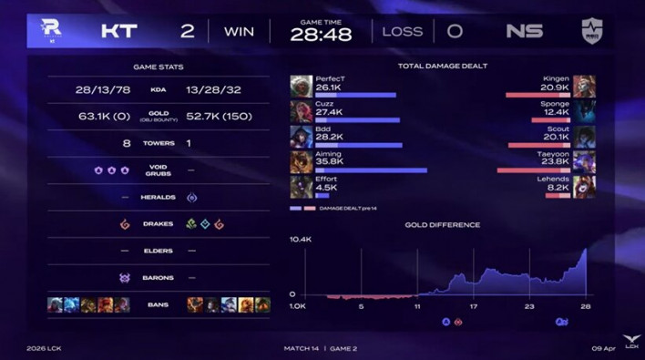As the game continued in a chaotic fashion, Nongshim began to close the gold gap. However, KT wiped out Nongshim in a fight near Baron initiated by their Nocturne, secured the Baron, and widened the gap further than before. With the Baron buff, they launched a final, decisive push to win the game, extending their winning streak to three.