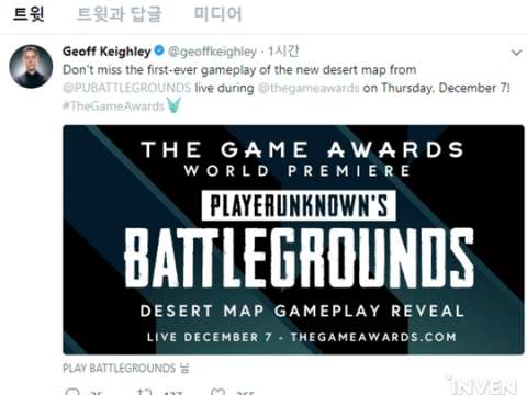 PLAYERUNKNOWN'S BATTLEGROUNDS (PUBG) Desert Map Gameplay will be revealed at The 2017 Game Awards on December 7th (Thu). The Game Awards is an annual game awarding event. The event host Geoff Keighley