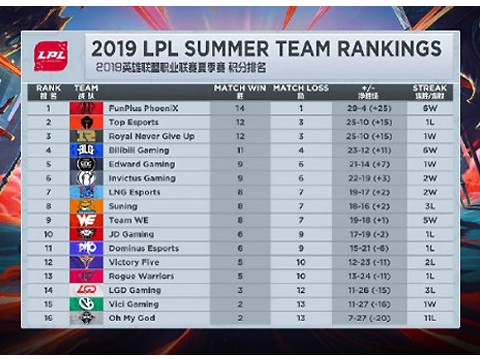2019 LPL Summer Split regular season is closed. The postseason of the top eight teams will begin on the 22nd.FunPlus Phoenix and Top Esports took first and second place and advanced to the semifinals.